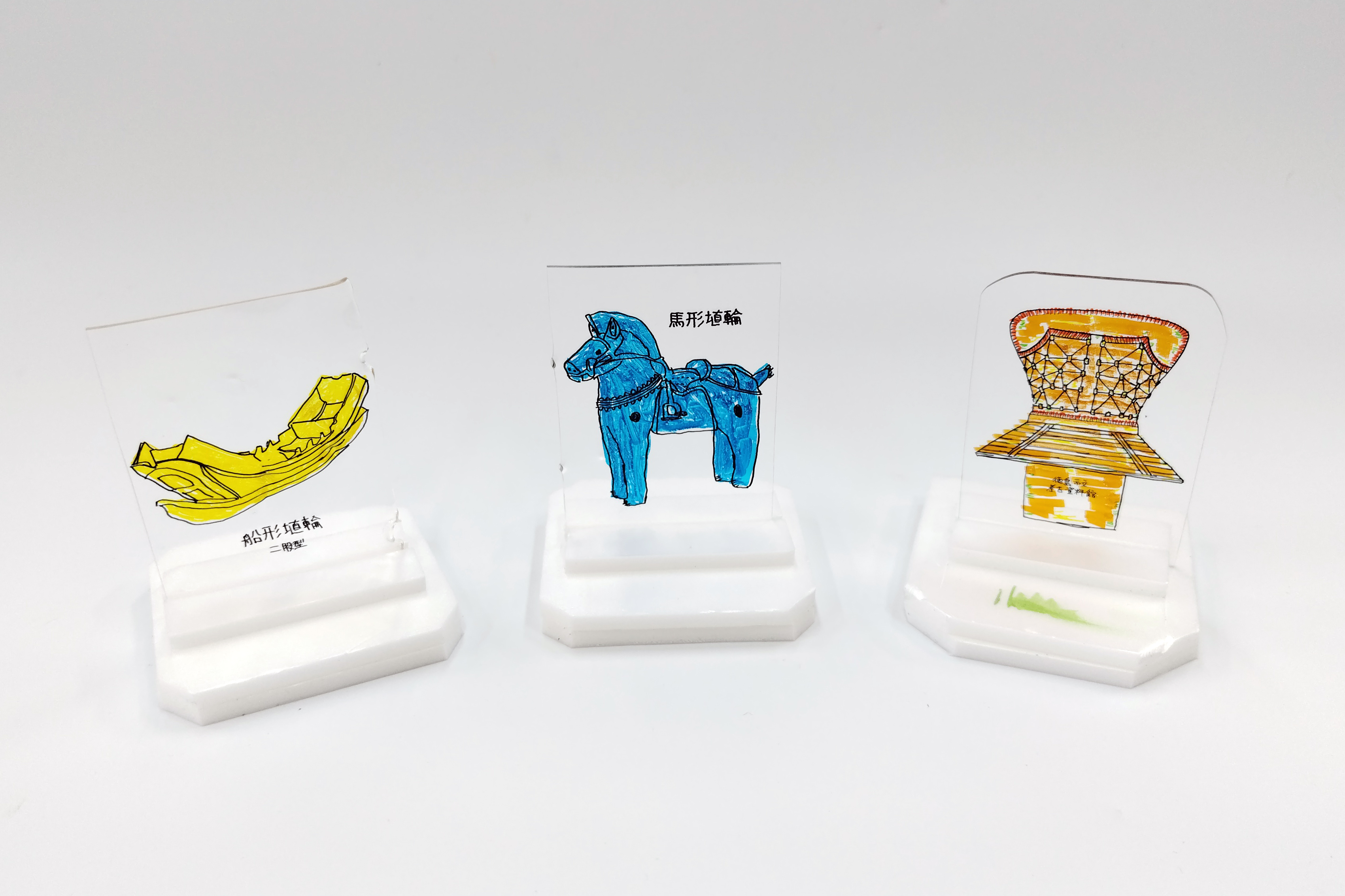 今回はこれまでに見つかった埴輪の実物やその埴輪から推測される埴輪のイラストを観察し、透明のプラ板に写し描きしたものをトースターで熱収縮させてアクリルスタンド風に仕上げてみます。